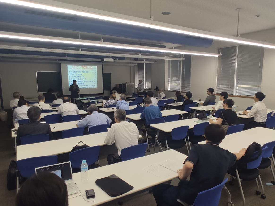今回の記念講演は、伊藤忠総研 委託研究員 杉浦 敏廣 氏による「ウクライナ戦争の行方=ロシア地下資源開発の現況と近未来=」についてでした。ロシア政府による一方的な歴史認識と史実の違い、ウクライナ戦争を左右する原油価格と対中資源植民地化など、ロシアの専門家としてソビエト連邦時代から二十数年にわたり現地に駐在した経験による腑に落ちる説明でした。